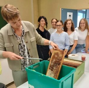 2-jour 1-Mme Péron et toute l’équipe. Il faut enlever les opercules de cire qui ferment chaque alvéole remplie de miel